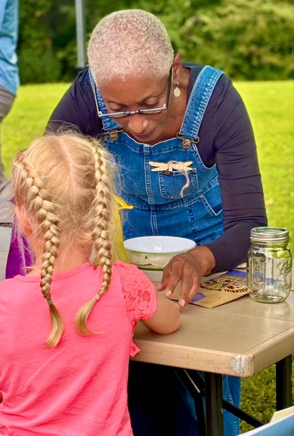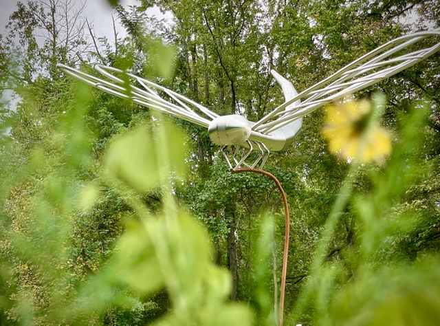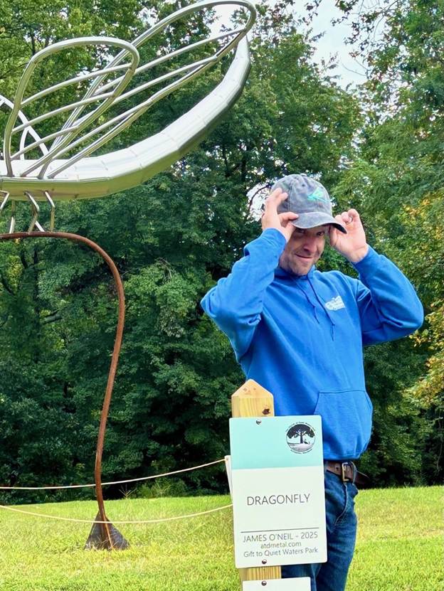 In September 2025, we joined to celebrate the new Dragonfly sculpture and its talented creator, local sculptor James O’Neil. The event featured exchanges between the artist and the audience as to his technique and inspiration, a story teller, educational materials on insects, dragonfly tattoos, dragonfly souvenirs, and refreshments donated by Main & Market and Giant. It was an exceptional team effort among the Sculpture Committee members, the Park staff, other members of the Board and a gifted volunteer. It was a joy to have James’ family there to witness the accolades. County Council Member Lisa Rodvien came and was treated to a tour of the activities. Erica Matthews, Deputy Director of AA County Recreation and Parks, joined us to appreciate the beauty now enhancing the Quiet Waters Park. After our outreach, Rick Hutzell of the Banner wrote a wonderful article featuring the sculpture, the artist and the Park’s sculpture program.